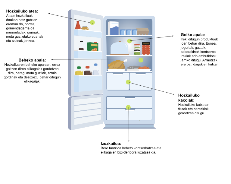 Lehenengo aholku oso garrantzitsua dena temperatura da. Hozkailuaren funtzionamendua baldintza onetan mantendu beharko dugu. Tenperatura egokiena 0º-5º bitartekoa izan beharko da. Hozkailuaren eremuaren arabera tenperatura aldatuko da pixka bat, horregatik garrantzitsua da jakitea gauza bakoitzak non kokatu.